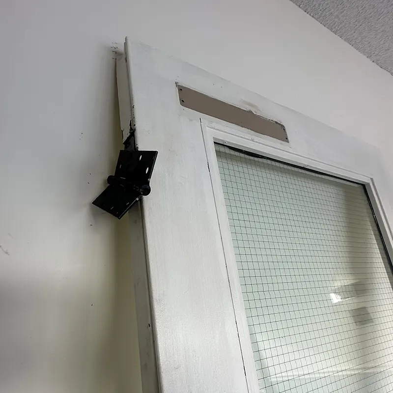 Broken Door and Hinges lost its fire rating at this commercial property. Our team replaced the door with new hinges, panic bar, door closer and lever trim!