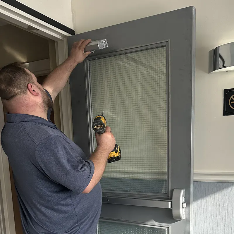 Rusted out Hinges, Broken Panic Bar and Failing Detex Unit. Repaired Detex Unit, Installed new Door Closer, Replaced Panic Bar. Door is working as intended - Completed Installation.